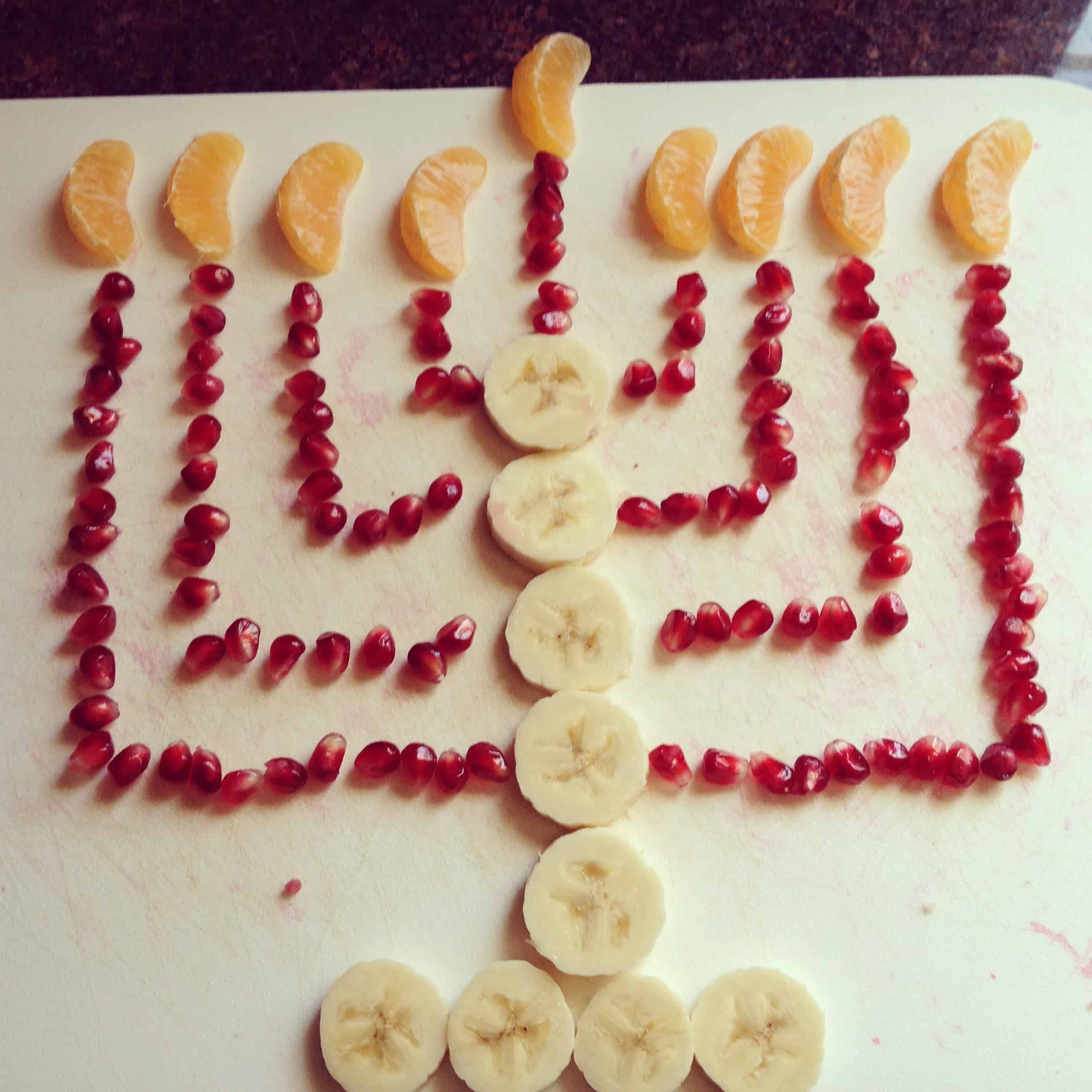 A menorah made from bananas, pomegranate seeds and clementines. My kids were so excited they couldn’t decide what to eat first.