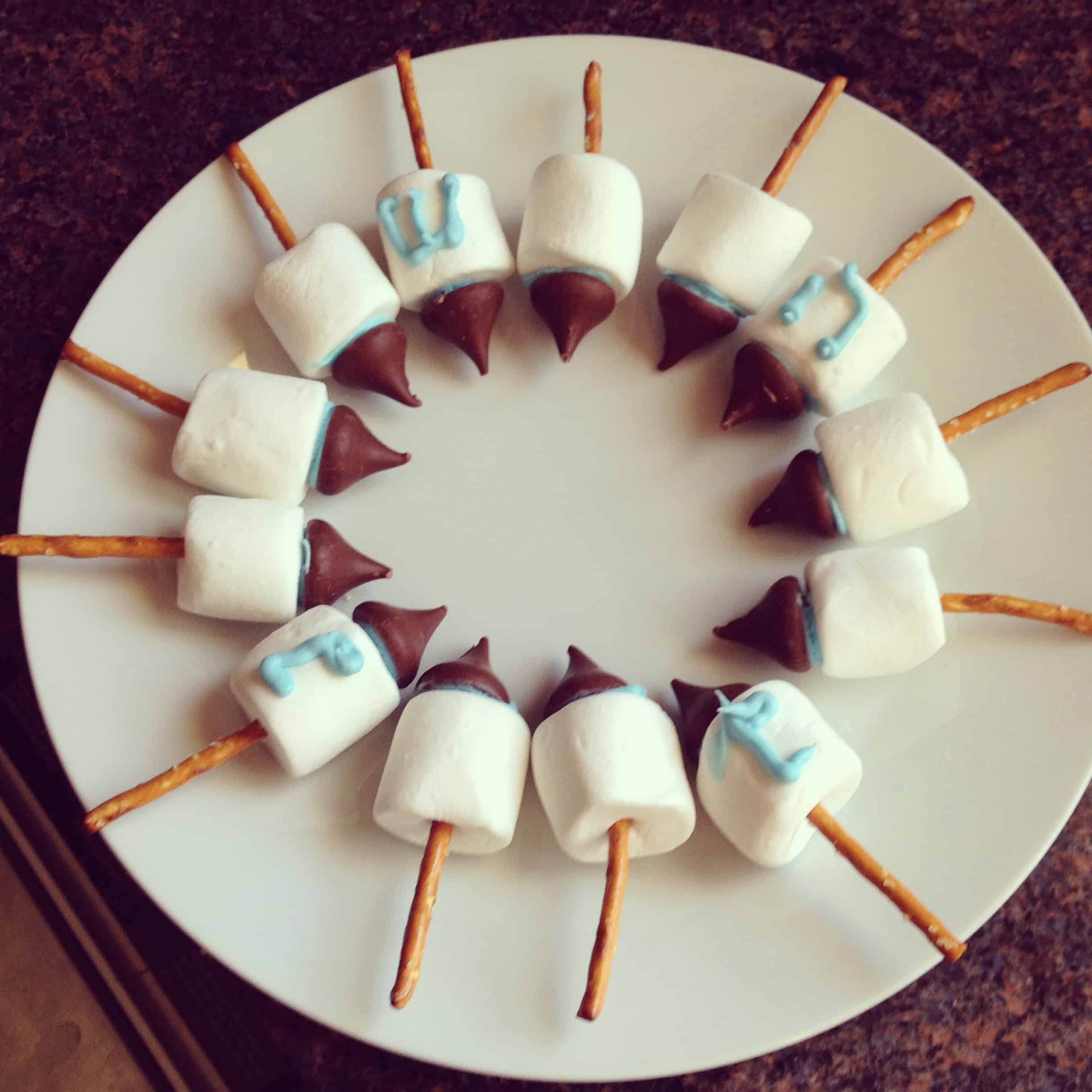 Dreidels made out of pretzel sticks, marshmallows and Hershey’s kisses. Glued together with frosting, and Hebrew letters written in frosting as well.